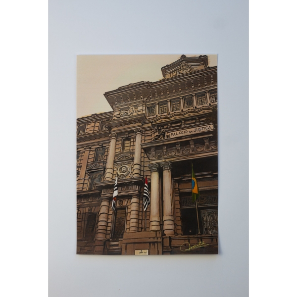 Esta obra apresenta o Palácio da Justiça, localizado na Praça da Sé. Projetado pelo escritório de Ramos de Azevedo, o edifício é uma joia inspirada no Palácio da Justiça de Roma. A pintura foca na monumentalidade das colunas e nos detalhes escultóricos que simbolizam a lei e a ordem.