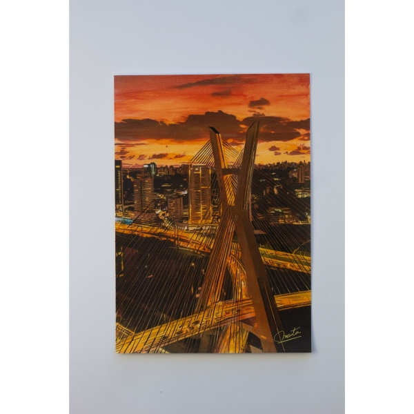 Esta obra captura a Ponte Estaiada, símbolo da engenharia e da modernidade paulistana. A composição privilegia um ângulo que destaca a complexidade dos cabos de sustentação, que cortam a cena de forma dinâmica, guiando o olhar pelo cenário urbano.